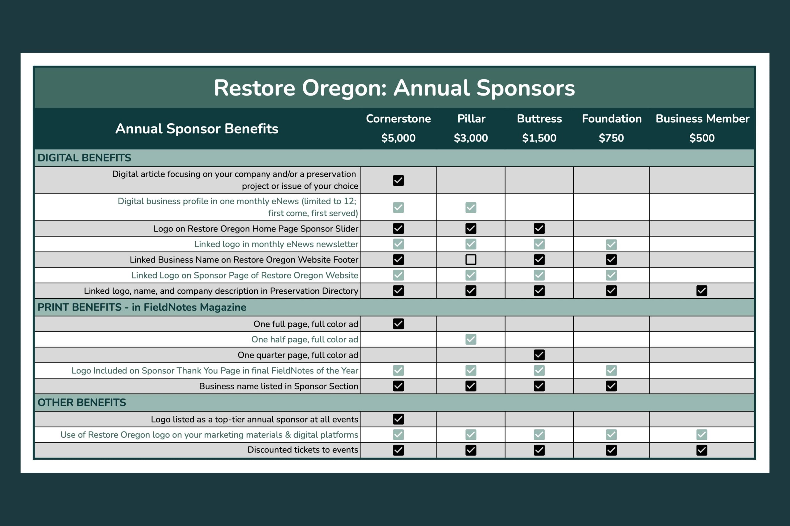 To renew your business membership or learn more about the comprehensive benefits of annual sponsorship, please email our Director of Development, Keith, at Keith@restoreoregon.org